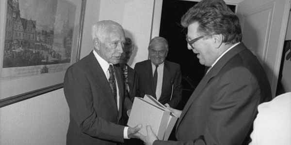 Der Präsident des Deutschen Bundestages, Dr. Philipp Jenninger, empfängt 1986 den rechts-nationalistischen Schriftsteller und das frühere "Freikorps"-Mitglied" Ernst Jünger in seiner Dienstvilla in Bad Godesberg.