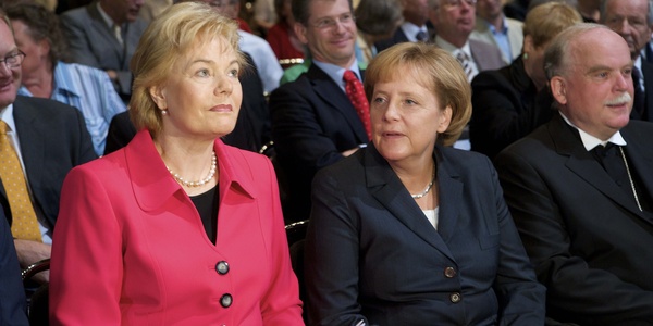 Erika Steinbach (links), Vorsitzende des BdV mit Angela Merkel (CDU) beim "Tag der Heimat" des Bund der Vertriebenen im August 2009 in Berlin.