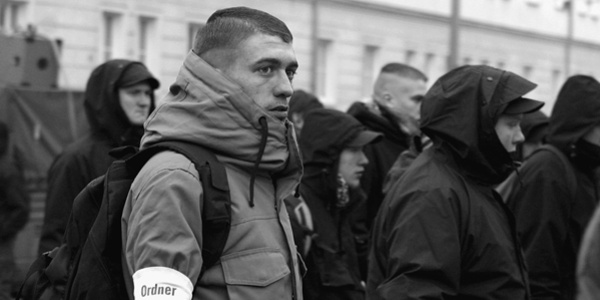 Dennis E. als Ordner auf einem Neonaziaufmarsch in Berlin.