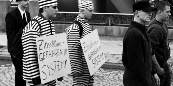 »Zinssklaven« auf der »Antikap«-Demonstartion am 1. April 2006 in Arnstadt. Den »Kapitalisten« ganz links spielt der NPD-Kreisvorsitzende (Ilmkreis) Sven Geyer