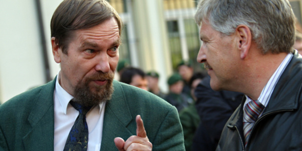 Der Leiter der Artgemeinschaft Jürgen Rieger (links) bei einer Neonazidemonstration am 14. Oktober 2006 in Nürnberg. Hier im Gespräch mit dem NPD-Vorsitzenden Udo Voigt.