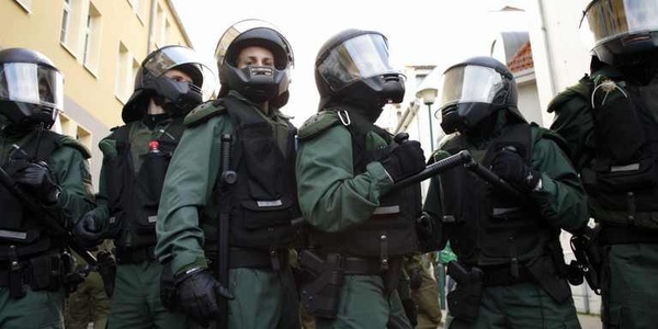 Polizeibeamte in Seelow im Einsatz gegen AntifaschistInnen.