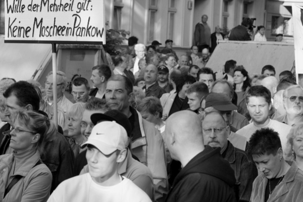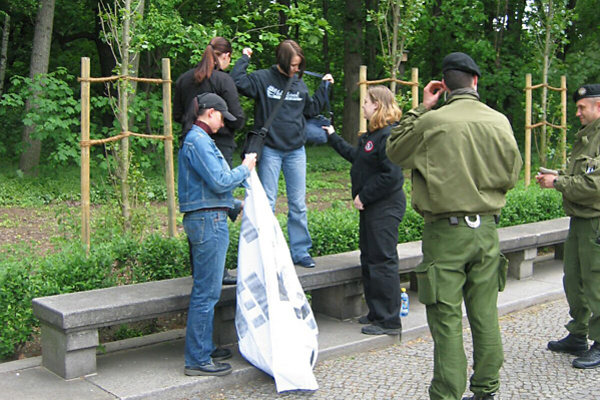 Die KS-Tor protestiert im Juli 2004 gegen das Mahnmal für die ermordeten Juden Europas auf dem Alexanderplatz, v.l.n.r.: Ines W., Nicole St. und Björn W.