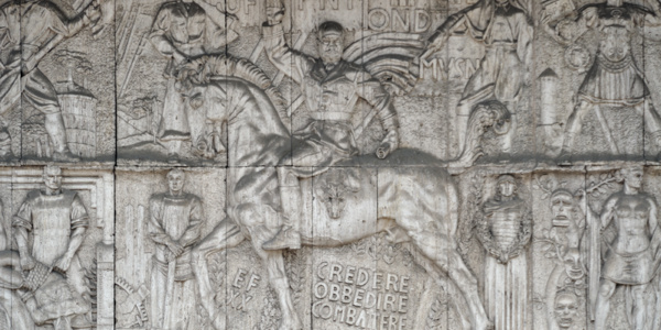 Mittelteil des faschistischen Mussolini-Reliefs am ehemaligen Haus des Faschismus in Bozen (Südtirol). Benito Mussolini hoch zu Ross und mit faschistischem Gruß.