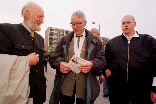 Teilnehmer einer NPD-Demonstration in Lüdenscheid im Januar 2002 mit Keltenkreuz-Symbolik auf der Jacke.