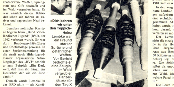 Mit Blick auf das Ausmaß der Funde (laut Lembkes selbst erstellter Liste u.a. automatische Waffen, 13.520 Schuss Munition, 50 Panzerabwehrrohre, 156 kg Sprengstoff, 230 Sprengköpfe, 258 Handgranaten, chemische Kampfstoffe (u.a. Phosphor, Zyankali, Arsen und Strychnin) sowie Bundeswehrunterlagen über das Sprengen und Minenlegen sowie zur Panzerabwehr) erklärte der damalige Innenminister Egbert Möcklinghoff: »die Waffen können nicht aus Diebstählen bei der Bundeswehr stammen sondern müssen regelrecht angeliefert worden sein«. Die Herkunft der Waffen konnte jedenfalls, laut offiziellen Angaben, nicht festgestellt werden. Lembke nahm sich im Gefängnis nach einigen Tagen Haft das Leben und konnte so nichts mehr zu dem Fall beitragen. Kurz vorher soll er allerdings gegenüber einem Beamten angegeben haben, dass er die Herkunft der Waffen aufdecken werde.