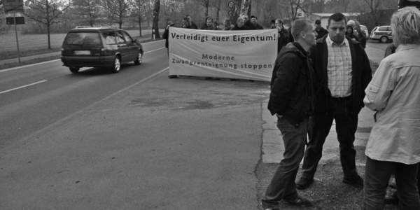Die NPD-Aktivisten Marcus Neumann (rechts) und André G. (links) protestieren am 22. April 2009 gegen den Abriss von Garagen in Ueckermünde.