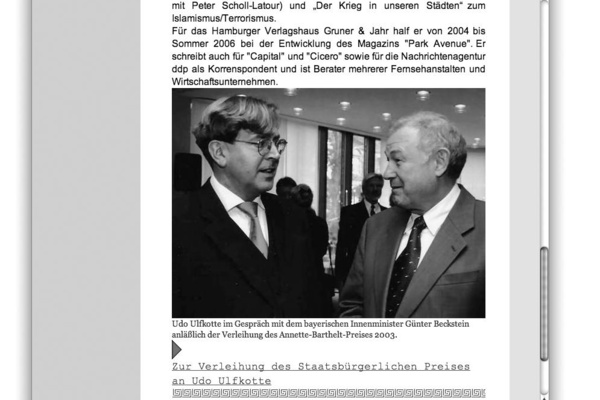Der Vorgängerverein Pax Europa wurde im Dezember 2006 in Königswinter gegründet. Bei der ersten ordentlichen Mitgliederversammlung im Juni 2007 in Bonn wurde der Publizist Udo Ulfkotte (siehe AIB 85) in den Vorstand gewählt. Er verließ die BPE Ende 2008 wegen eines »zunehmend extremistischen Kurses«. Er bezog sich auf im Internet veröffentlichte Postkartenmotive, die Muslime als Schweine, Pädophile und Terroristen darstellten.4 Dieser Abgrenzungsbedarf gegenüber einem »extremistischen« Kurs erstaunt insofern, als dass Ulfkotte MigrantInnen als »Wohlstandsvernichter« bezeichnete, »Rückführungsbeauftragte statt Integrationsbeauftragte« forderte und prognostizierte, dass »möglicherweise (…) ja bald schon nicht nur Wahlplakate von Politikern an Laternenpfählen hängen«.5