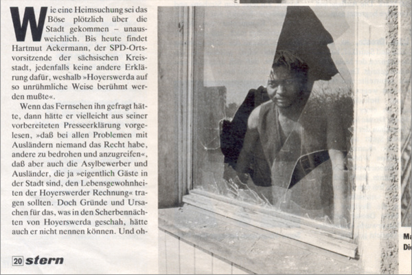 Das rassistische Pogrom von Hoyerswerda war der Auftakt zu einer ganzen Reihe von ähnlichen Angriffen, die sich z.B. in Rostock, Solingen und Mölln ereigneten und bald auch erste Todesopfer forderten. In Folge jener Welle rassistischer Gewalt wurden 1993 die Asylgesetze in der Bundesrepublik geändert. Für Flüchtlinge war es danach sehr viel schwieriger Asyl in Deutschland zu erhalten. Der Hass auf der Straße wurde somit auch durch die bundesdeutsche Innenpolitik legitimiert: »Wenn das Volk uns die Legitimation entzieht, müssen wir unsere Politik ändern«, kommentierte der damalige SPD-Vorsitzende Engholm diese Vorgänge.