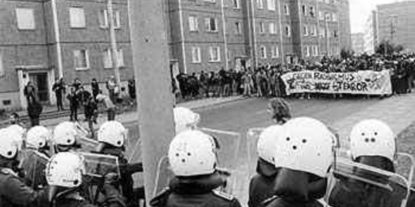 MN: Ich war im Wohnheim. Plötzlich kam eine große Gruppe von Skinheads und fing an, mit Steinen und Flaschen auf unser Haus zu werfen. Wir haben natürlich reagiert, aber es kamen auch Nachbarn aus anderen Wohnblöcken. Die Nachbarn ermutigten die Skinheads, klatschten in die Hände. Viele von denen, die ich vor dem Haus gesehen habe, waren keine Skins, sondern Nachbarn und Kollegen. Viele habe ich erkannt, das war schmerzlich. In der Flüchtlingsunterkunft in der Thomas-Müntzer-Straße gingen die Angriffe zwei Tage später los.