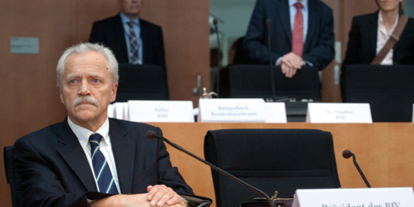 Der ehemalige Chef des Bundesamtes für Verfassungsschutz (BfV), Heinz Fromm am 5. Juli 2012 vor dem NSU-Untersuchungsausschuss des Bundestages. Im Hintergund sein Nachfolger Hans-Georg Maaßen.