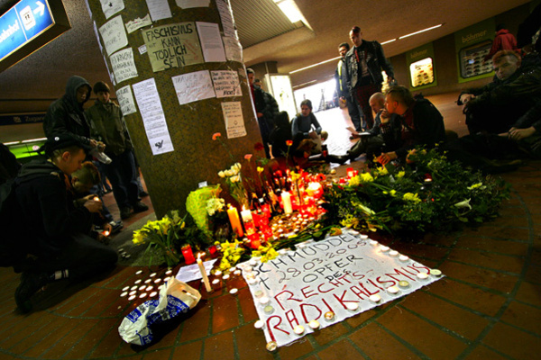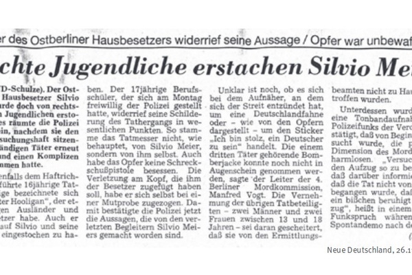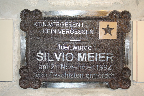 Am 21. November 1992 wurde der damals 27jährige Silvio Meier im Ostberliner U-Bahnhof Samariterstraße von Neonazis ermordet. 1986 war er von Quedlinburg nach Berlin-Friedrichshain gezogen, dort engagierte er sich u. a. in der Umweltbibliothek, der Kirche von Unten und später in der Hausbesetzerbewegung. Seit dem Mord findet an diesem Ort jedes Jahr eine von Antifa-Gruppen organisierte Mahnwache und am auf den Todestag folgenden Wochenende eine Gedenkdemonstration statt.